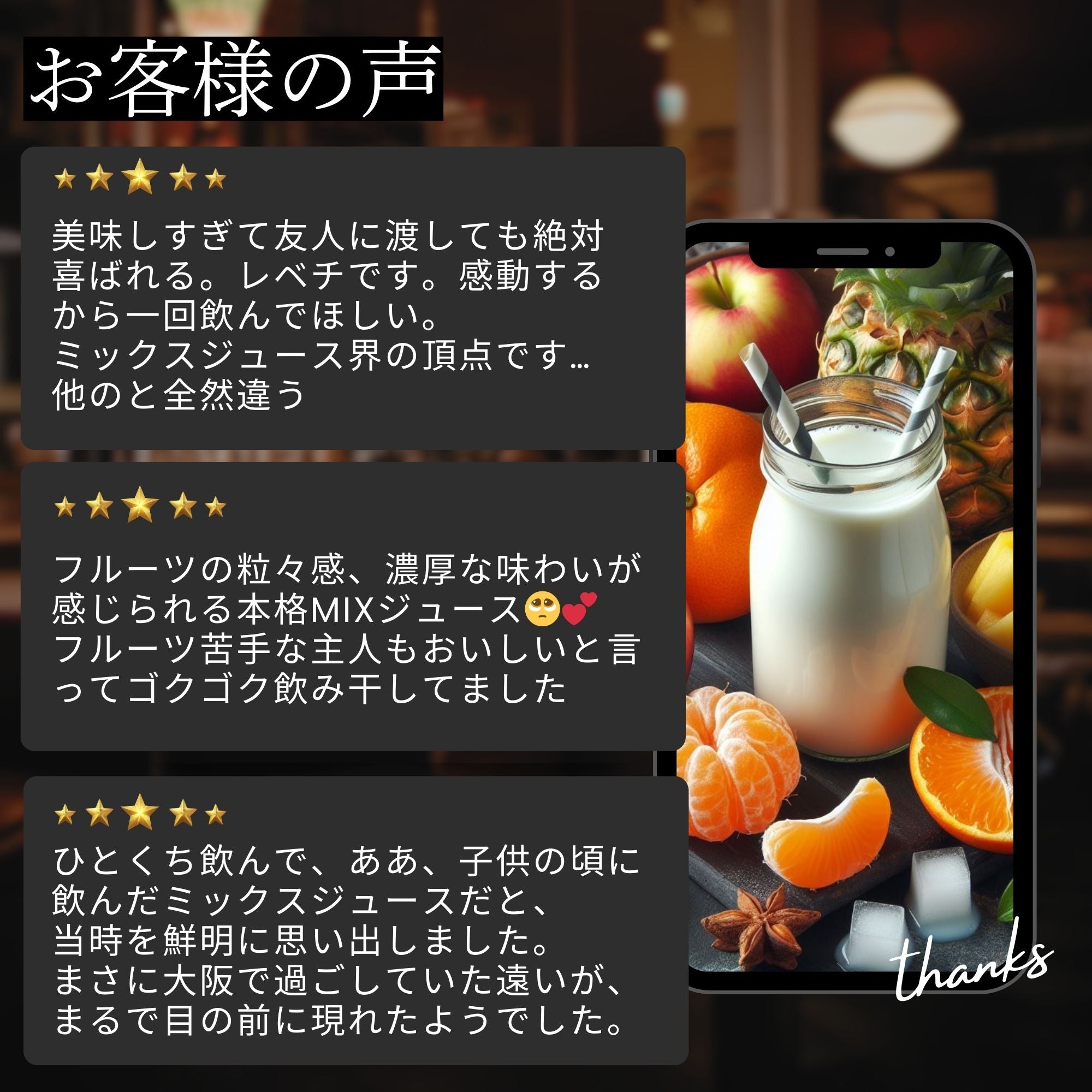 ドロッとしたミックスジュースとは違い、つぶつぶの果肉感をお楽しみいただけます。